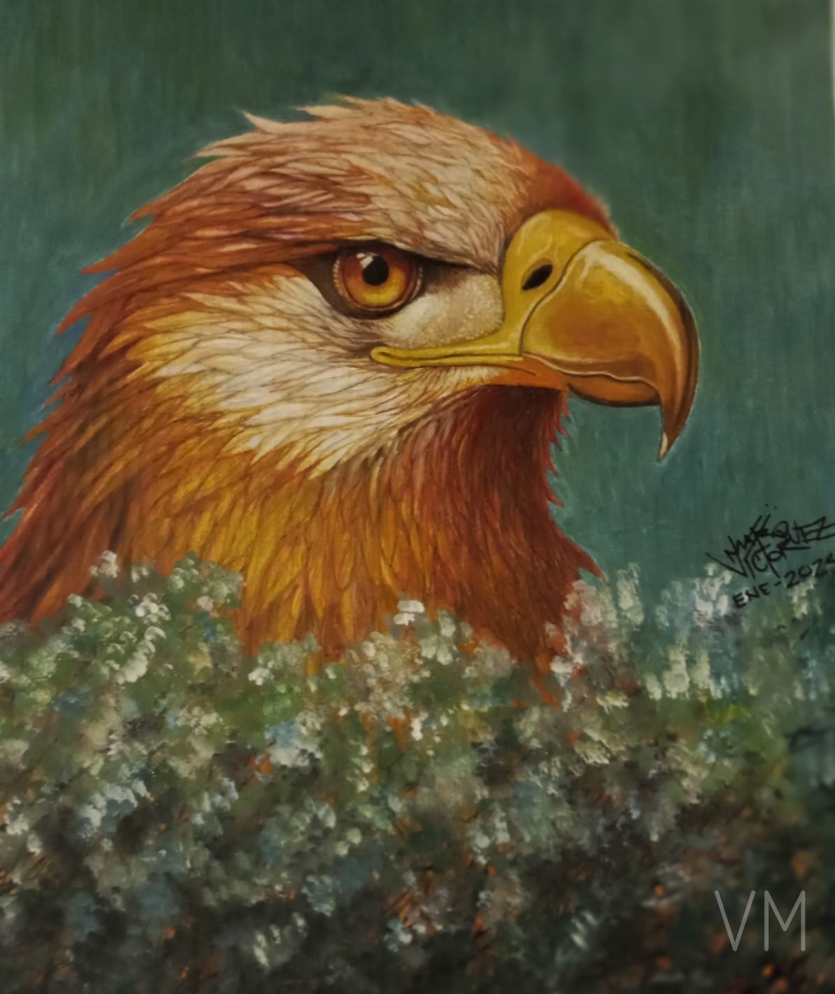 Majestuoso retrato de un águila dorada con mirada penetrante, pintura realista.