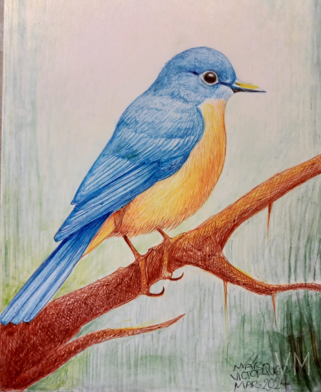 Pájaro azulejo en rama con fondo primaveral verde, colores brillantes.