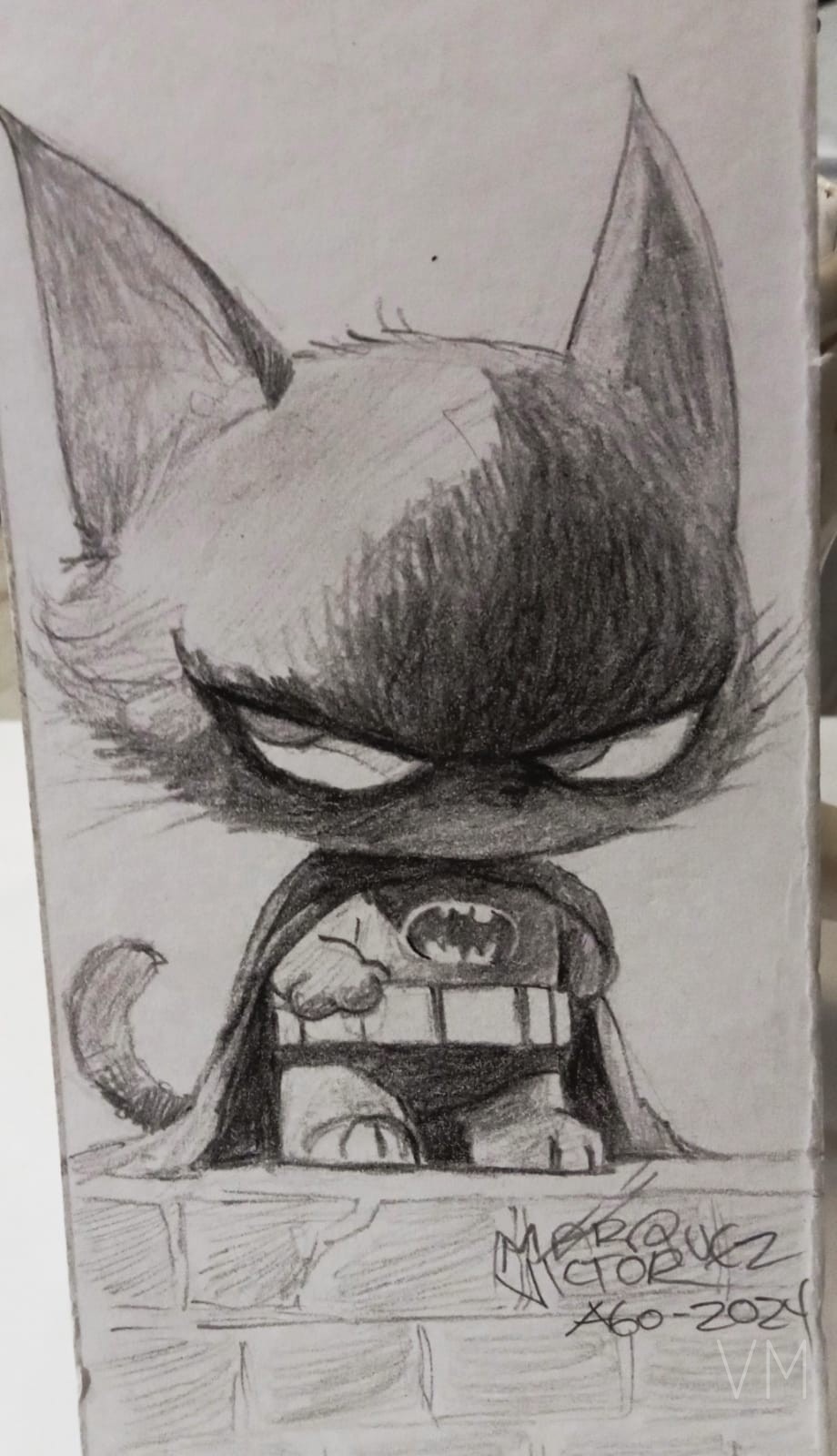 Pequeño Batman en estilo chibi asomándose desde un muro de ladrillos. Dibujo en formato separador.