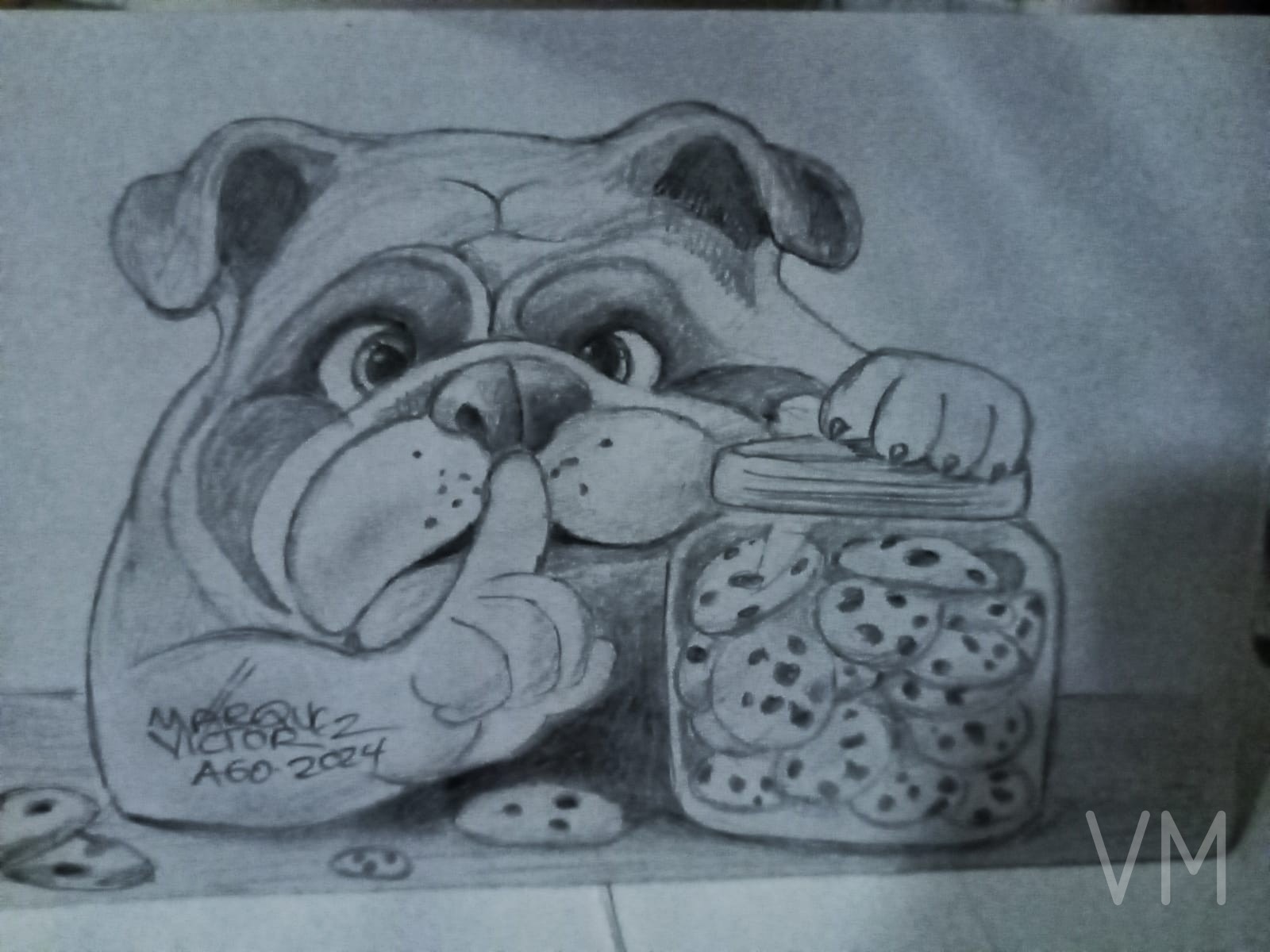 Bulldog travieso robando galletas del frasco con cara de culpabilidad.