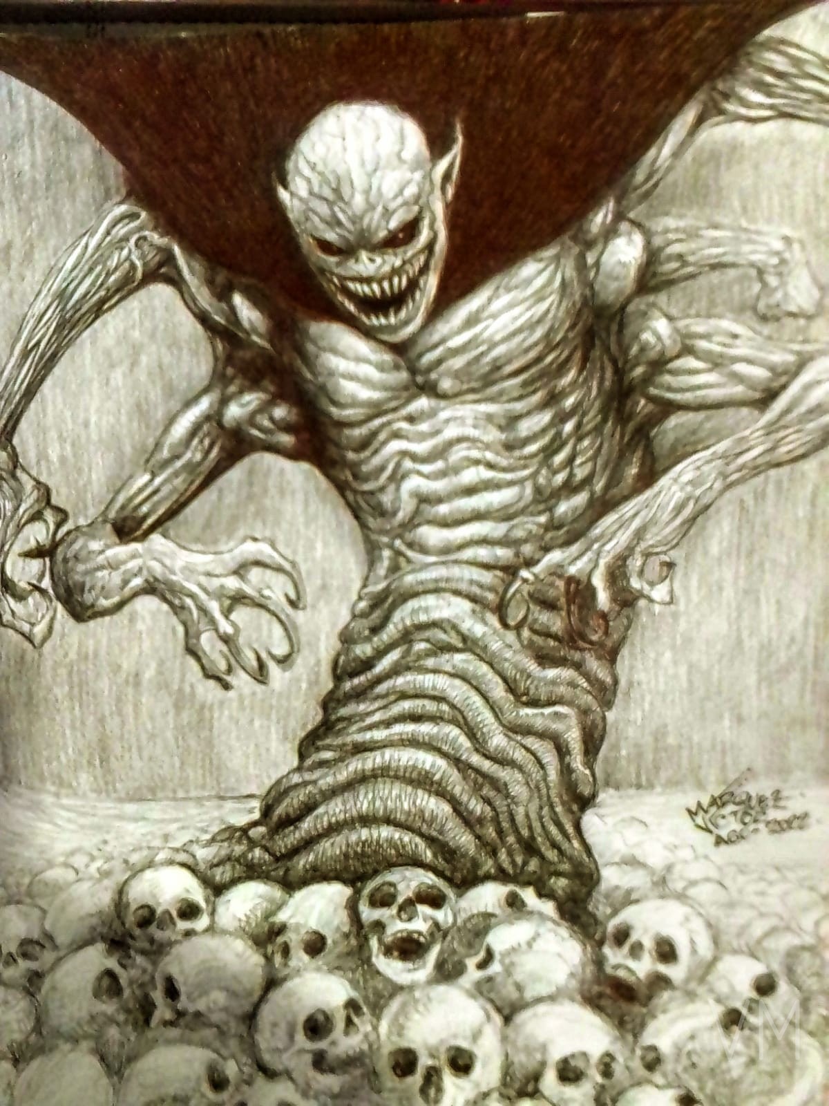 Demonio colosal emergiendo de una montaña de calaveras con brazos extendidos amenazantes.