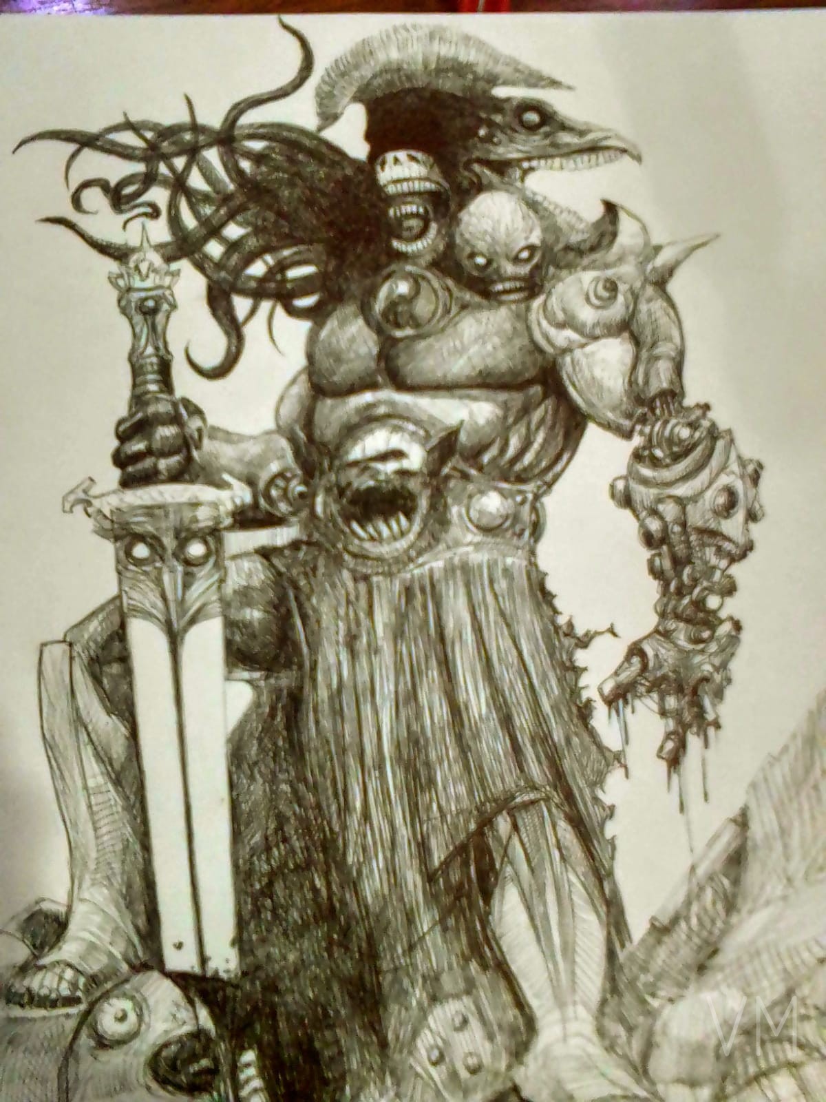Guerrero demoniaco con múltiples ojos y espada masiva, sosteniendo cabezas cortadas.