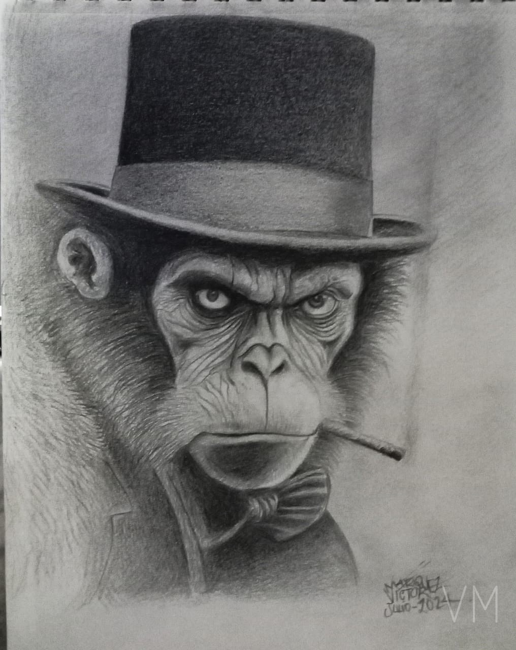 Gorila con sombrero de copa, moño y cigarro, estilo caballero victoriano con actitud.