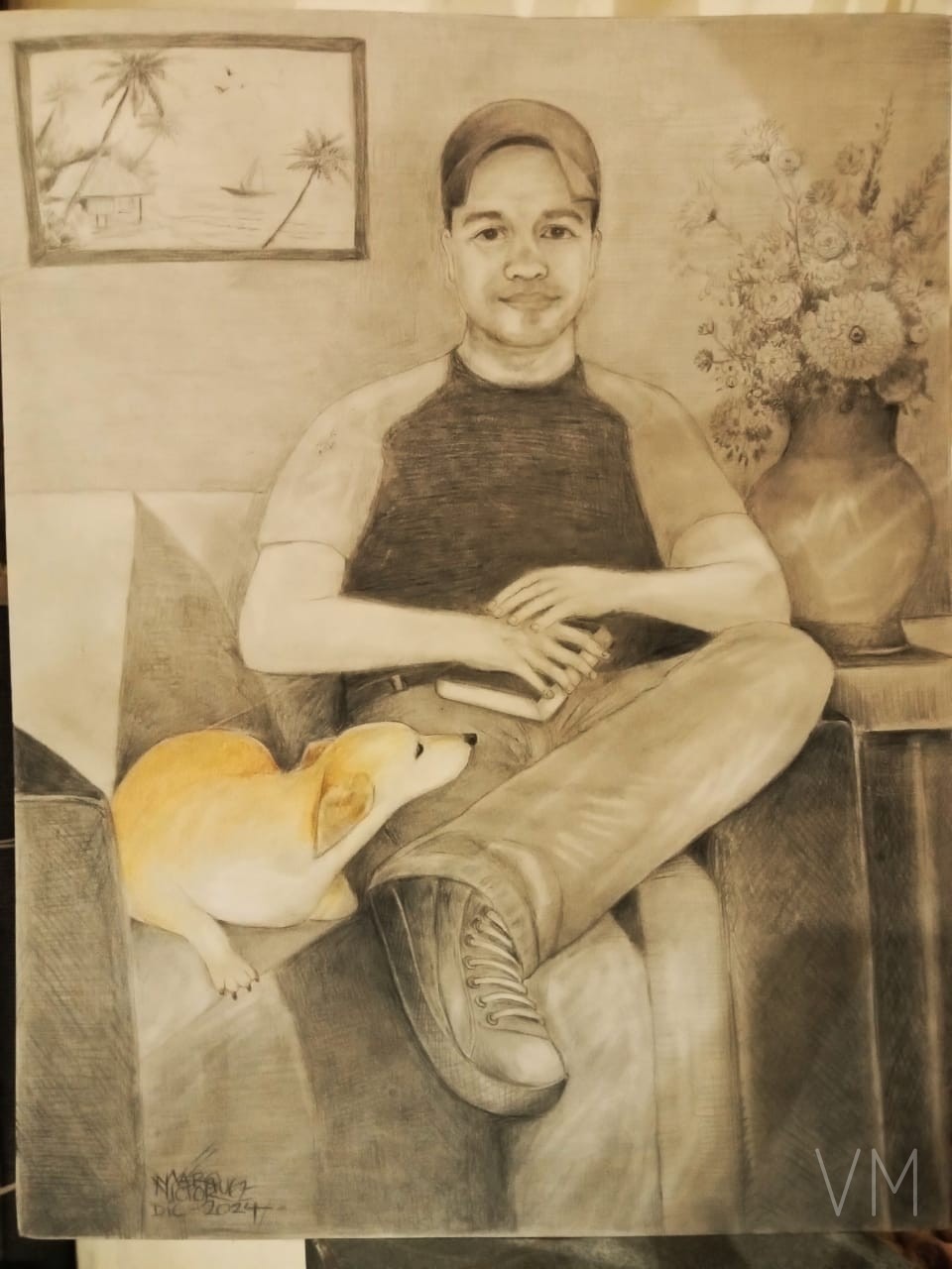 Retrato de un joven sentado en sofá con cuadro tropical y su perrito color miel.