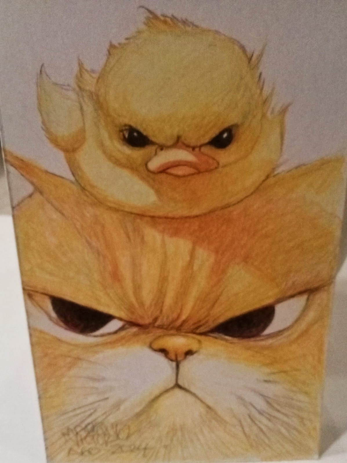 Separador con gato enojado y pollito furioso, dúo cómico en miniatura
