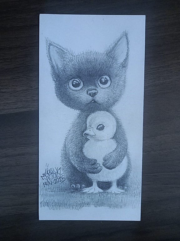 Gato negro abrazando tiernamente a un patito, separador de amistad inesperada
