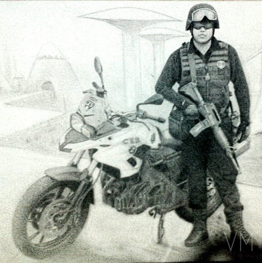 Retrato fotorrealista de un oficial de policía con su motocicleta de servicio.