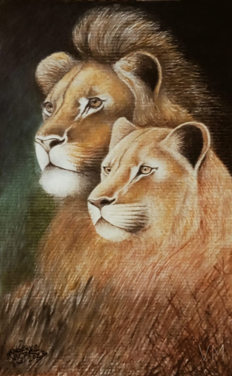 Pareja de leones majestuosos en retrato doble, león y leona con pelaje dorado.