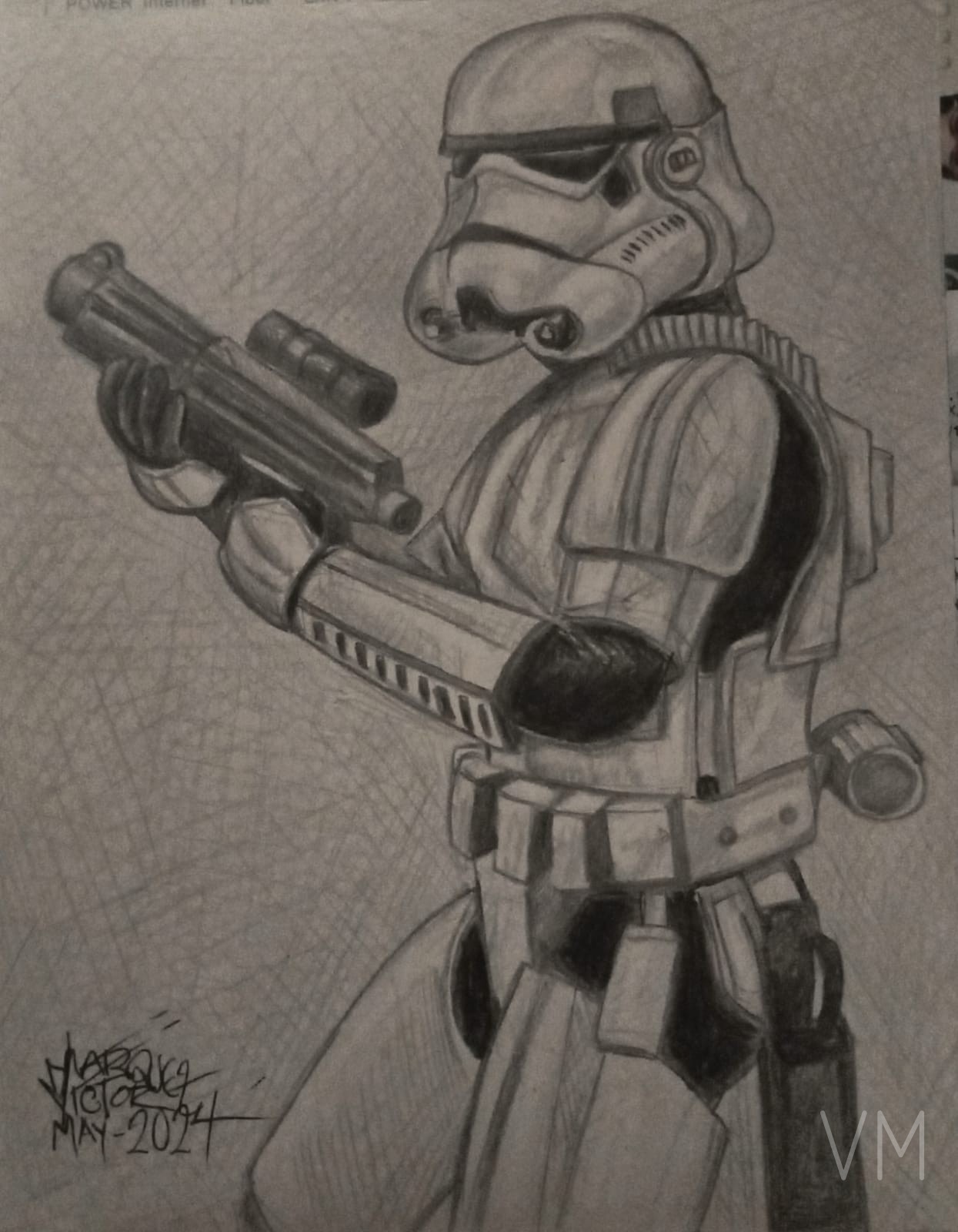 Soldado imperial Stormtrooper empuñando su bláster, dibujo detallado a grafito.