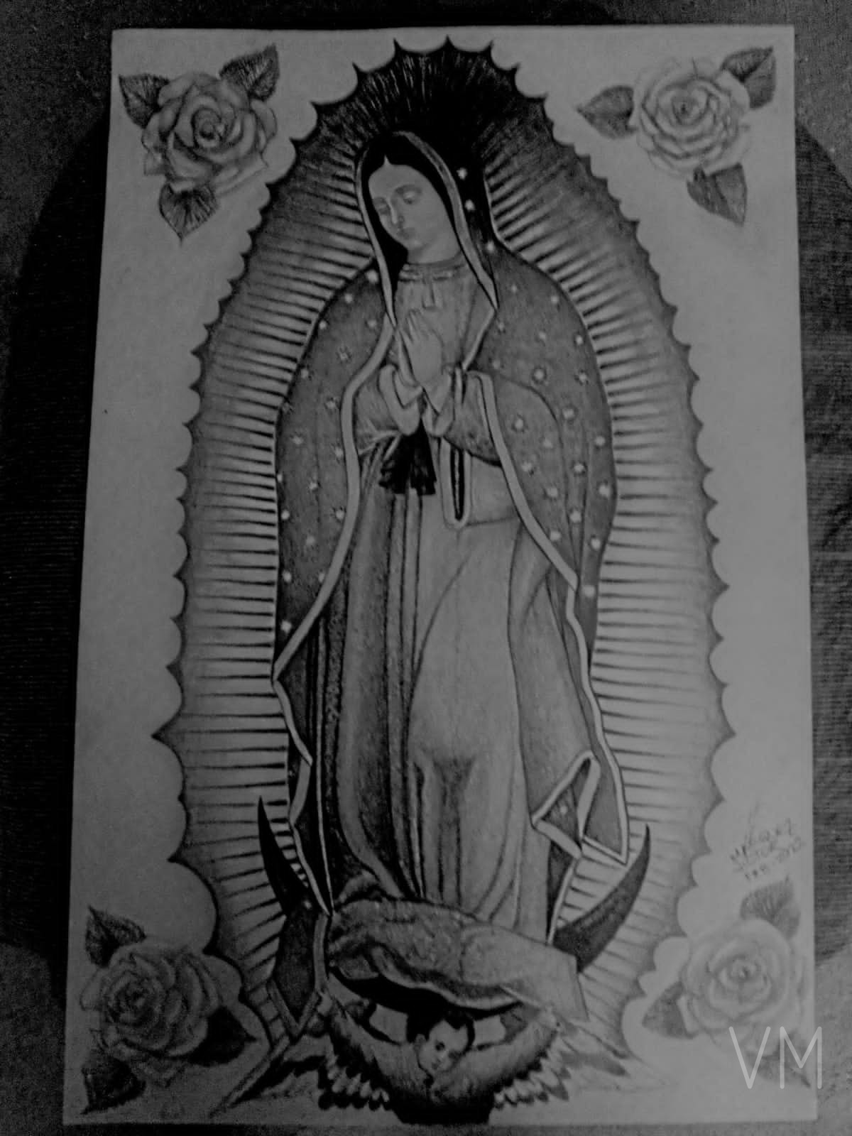 Representación devocional de la Virgen de Guadalupe rodeada de rosas, a grafito.